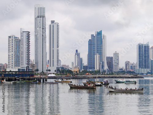 © dam, Fototapeta premium Fishing boats anchored with skyscrapers in Panama