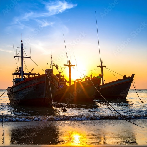 © Kirana, Fototapeta premium Fishing boats at sunset