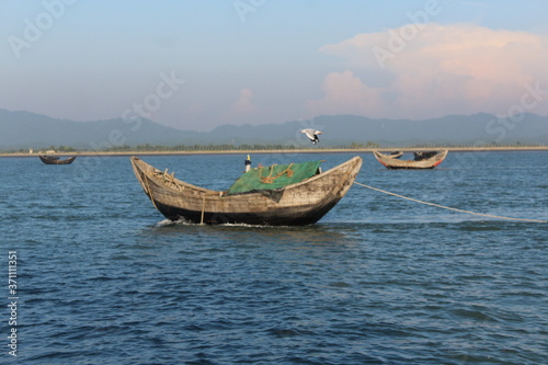 © Shariful, Fototapeta premium Fishing boats in Bay of Bengal Bangladesh Burma Border with a Seagal flying