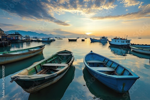 © Dhananjay, Fototapeta premium fishing boats moored in harbor at sunrise