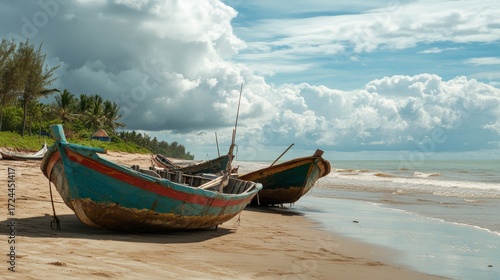 Fototapeta premium Fishing boats on beach during day, subject on right side, ample copy space on...