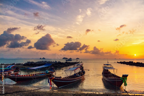 Fototapeta premium Fishing boats on the beach at sunset background