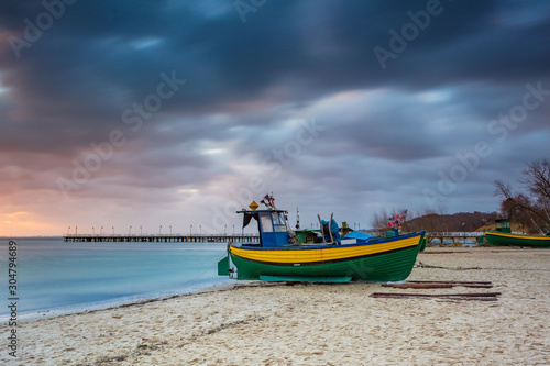 © vivoo, Fototapeta premium Fishing boats on the beach during sunrise in Gdynia. Baltic Sea. Poland