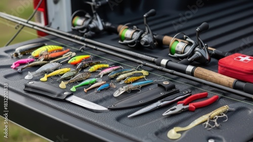 Fototapeta premium Fishing gear arrangement on truck bed with rods and lures