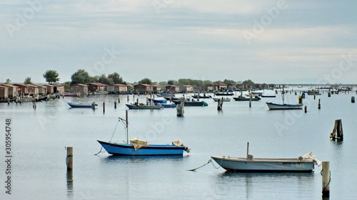 © Bob, Fototapeta premium Fishing huts and boats in the Delta del Po, Veneto, Italy.