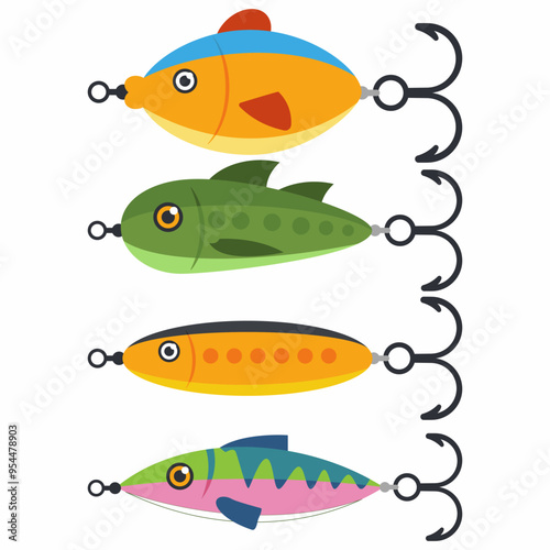 © Roi_and_Roi, Fototapeta premium Fishing lures vector cartoon set isolated on a white background.