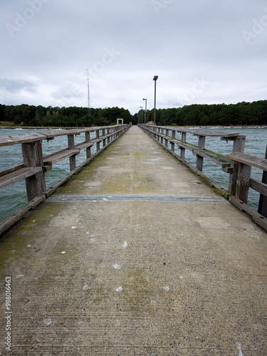 © Jessie, Obraz premium Fishing pier dock at an ocean with wooden rails