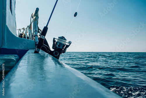 © Ahmed, Naklejka premium Fishing rod on a boat cruising through the open sea on a clear day