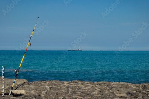 Fototapeta premium Fishing rod on a high rock, on the seashore.