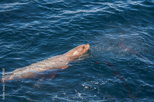 Obraz premium Fishing Steller's Sea Lion (Eumetopias jubatus) at sea off Chowiet Island, Semidi Islands, Alaska, USA