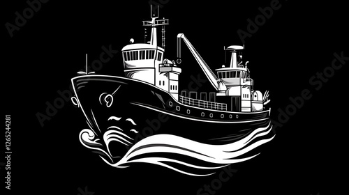 © Ren, Obraz premium Fishing Trawler at Sea: A Bold Black and White Illustration AI Generated