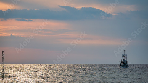 Fototapeta premium Fishing Trawler in Gokceada sea at sunset. Canakkale, Turkey