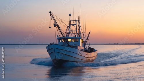 Naklejka premium Fishing trawler sailing at sunset.