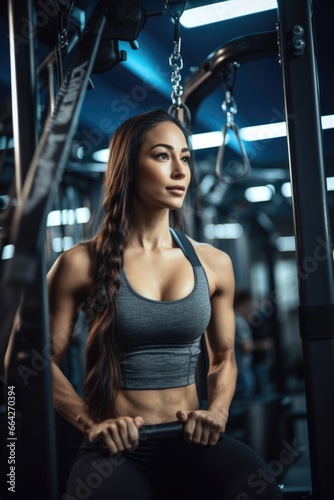 Fototapeta premium Fit and toned woman in gym. Fictional characters created by Generated AI.