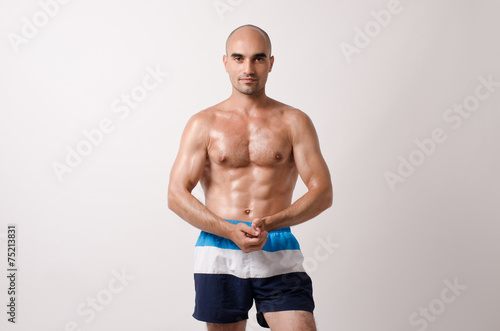 © luanateutzi, Fototapeta premium Fit bodybuilder showing his body.Muscular topless man in shorts.