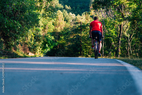Fototapeta premium Fit cyclist rides his bicycle (bike) on an empty road in nature wearing a...