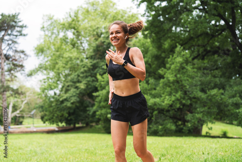 © Barillo Images, Fototapeta premium Fit female jogger exercising in green park in summer morning.