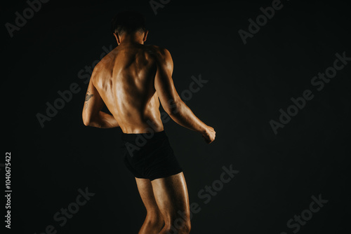 © qunica.com, Naklejka premium Fit man displaying his strong back muscles in a low light studio environment, showcasing fitness and strength.