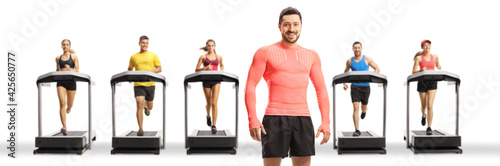 © Ljupco Smokovski, Obraz premium Fit muscular man posing with people running on treadmills in a row in the back