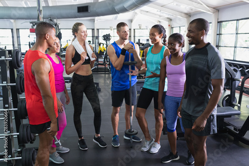 © WavebreakMediaMicro, Fototapeta premium Fit people interacting with each other in fitness center