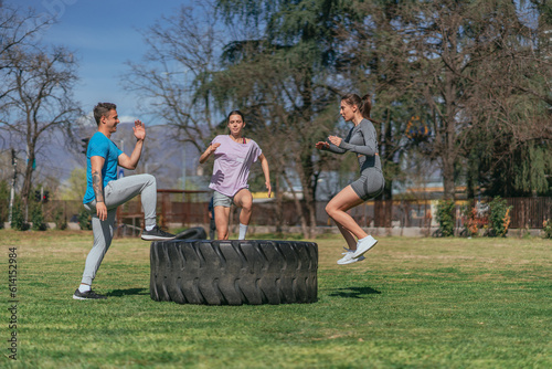 Obraz premium Fit sports friends exercising in the park, on a sunny day. They are doing jumps on a big truck tire