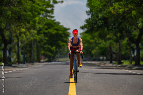 © Oleg, Fototapeta premium Fit woman cycling on empty road in summer, front view..