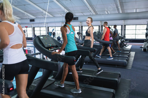 © wavebreak3, Fototapeta premium Fit woman interacting with her female friend while exercising on treadmill