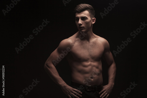 © Viorel Sima, Fototapeta premium fit young man posing in dark studio background with hands on wai