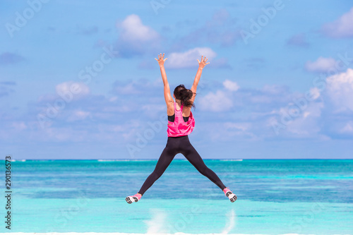 Fototapeta premium Fit young woman doing exercises on tropical white beach in her sportswear