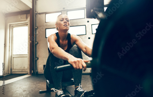 Obraz premium Fit young woman exercising on a gym rowing machine