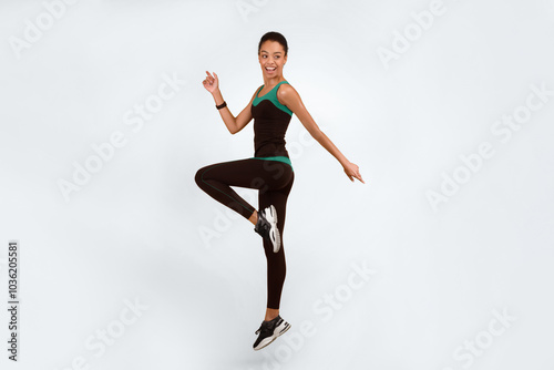 Obraz premium Fitness And Sport. Happy African American Girl Exercising Jumping Over Yellow...