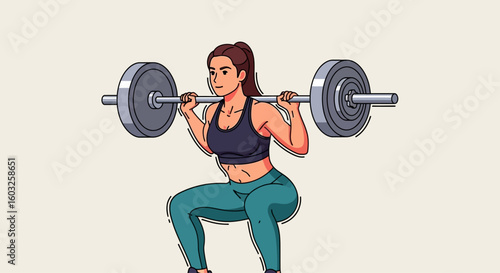 Obraz premium Fitness and strength training concept with a woman performing a heavy barbell squat exercise illustration