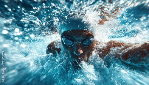 © Tetiana, Fototapeta premium Fitness Athlete Training: Swimmer In Action At Wave Pool Gym Center. Cardio Exercise And Panoramic Blue Water Swimming For Triathlon.