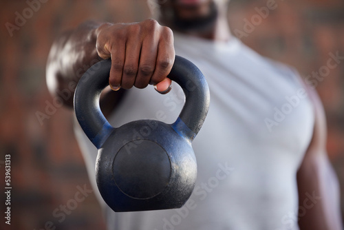 Fototapeta premium Fitness, bodybuilder and black man kettlebell training, exercise or workout...