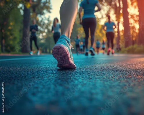 © Nawarit, Fototapeta premium Fitness challenge with a group of people exercising outdoors, active environment, sharp focus, bright lighting, high detail