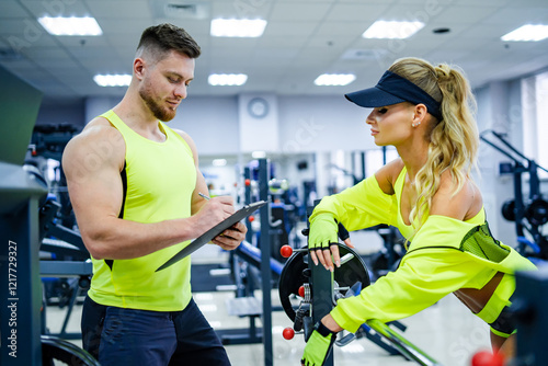 © Vadim, Obraz premium Fitness coaching in a bright gym setting. A fitness coach assists a female trainee in a well-lit gym, focusing on workout progress and motivation during training.