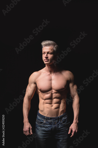 © sergiophoto, Fototapeta premium Fitness concept. Muscular and fit torso of young man having perfect abs, bicep and chest. Male hunk with athletic body on black background