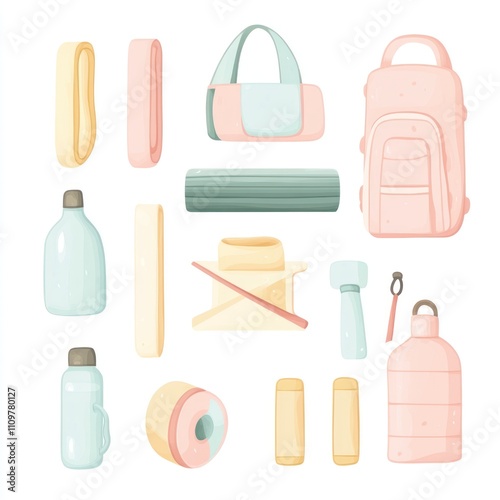 Obraz premium Fitness essentials yoga mat, resistance bands, water bottles, bag, and foam...