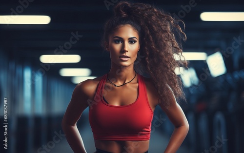 Fototapeta premium Fitness girl in red top in the gym. AI
