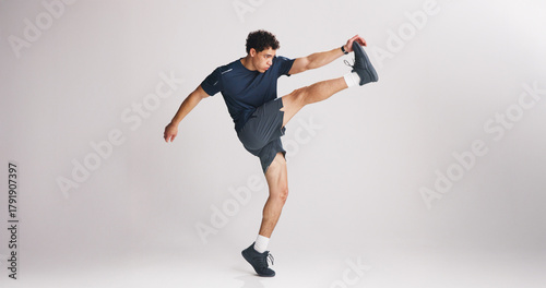 Naklejka premium Fitness, kick and stretching with man on studio space for start of training or workout routine. Exercise, legs and warm up with athlete on white background mockup for challenge or performance