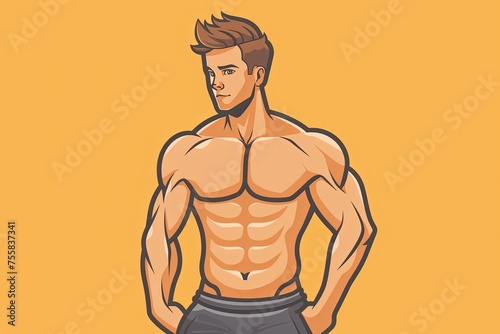 © phaloh, Fototapeta premium Fitness Model, Man shows abs while standing, Flat style. icon, orange background.