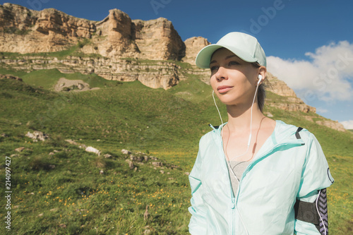 Naklejka premium Fitness runner woman listening to music on the nature. Portrait of beautiful girl wearing earphones earbuds and running cap. against the background of rocks field and blue sky