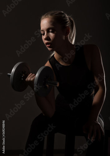 Obraz premium Fitness sexy girl with dumbbells on a dark background. Athlete doing exercises in the gym