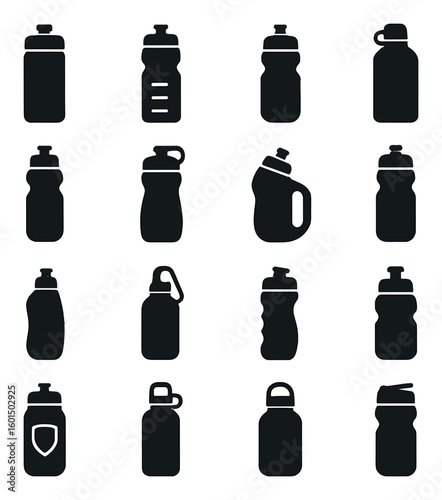 Fototapeta premium Fitness silhouette icon set: water bottle, flask, sports jug, hydration...
