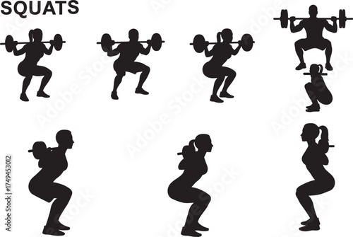 © crazycollection, Naklejka premium Fitness Silhouettes Icon Vector Collection, Exercise and Workout Poses, Gym and Wellness Flat Vector Illustrations