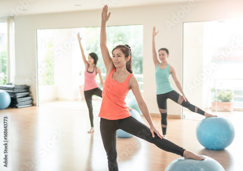 Naklejka premium fitness, sport, training, yoga and people concept - Asian woman stretching on yoga ball in gym.Group Of female Doing Yoga Indoors