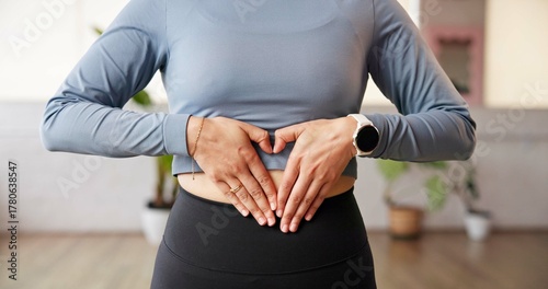 © peopleimages.com, Naklejka premium Fitness, stomach and person in gym with heart hands, gut health and inspiration for body goals. Sport, belly and athlete in studio with emoji, weight loss and digestion support in wellness routine.