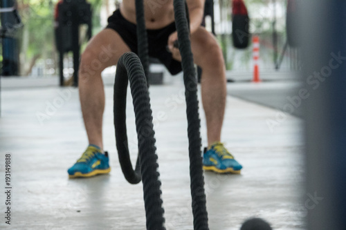 Naklejka premium Fitness trainner show how to play the sport rope equipment in the gym