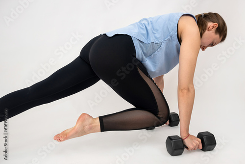 Obraz premium Fitness woman doing exercise workout with dumbbells isolated on white
