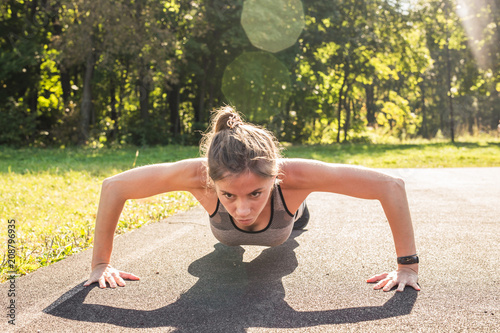 © satura_, Fototapeta premium Fitness woman doing push-ups during outdoor cross training workout. Beautiful young and fit fitness sport model training outside in park